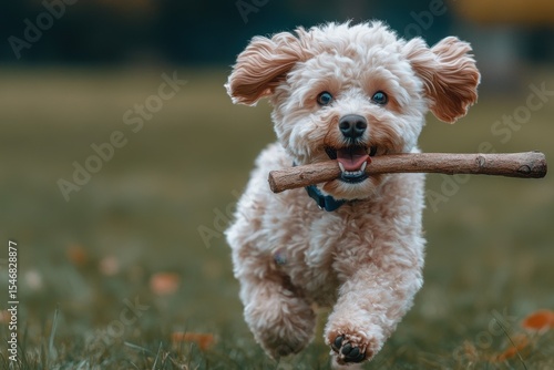 Small pet dog joyfully running with a wooden stick in its mouth in a grassy field, Small pet dog run with a wooden stick in mouth on green grass lawn in park