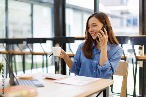 Smiling asian woman writing notes while making phone call and using laptop at workplace.