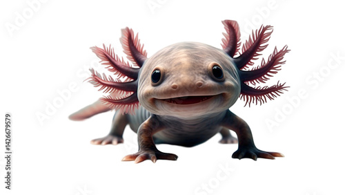Smiling Axolotl Underwater – Pink Gills and Cute Expression Isolated on White Background
