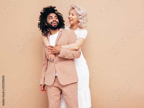 Smiling beautiful woman and her handsome boyfriend. Sexy cheerful multiracial family having tender moments on beige background in studio. Multiethnic models hugging. Embracing each other.Love concept