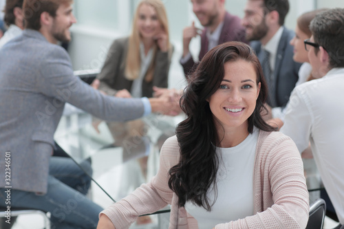 smiling business woman sitting in front of the table in the meeting room