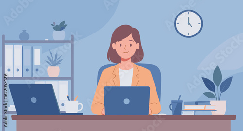 Smiling businesswoman working on laptop in modern office. Ideal for websites, blogs, and presentations on business, work, and success.