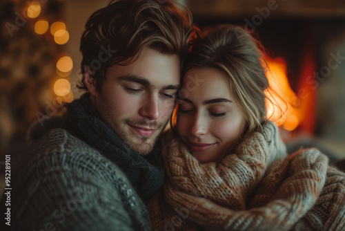 Smiling couple in warm clothing embracing and enjoying cozy moment by fireplace radiating warmth and joy, couple reflecting happiness of being together in love nest