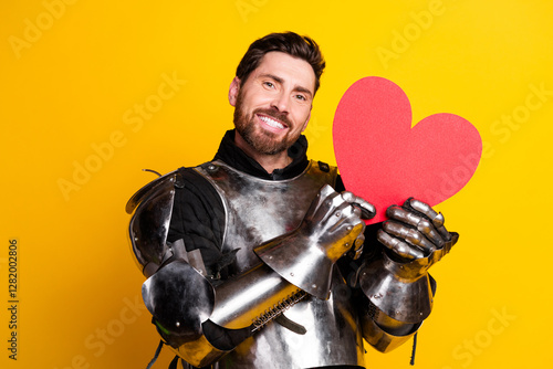 Smiling knight in shining armor holding a vibrant red heart on bright yellow background celebrating love and medieval charm