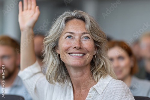 Smiling middle-aged woman raising hand to ask question during conference seminar session
