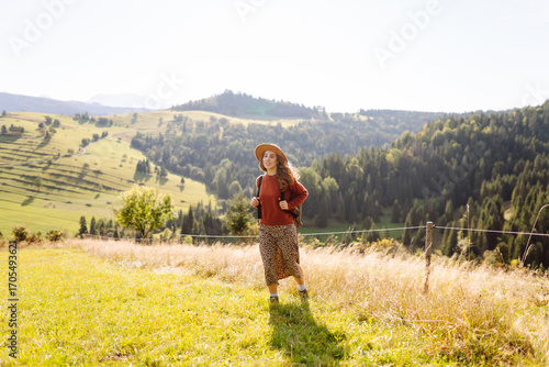 Smiling woman standing on a lush green field surrounded by mountains. Young female traveler with a backpack enjoying mountain scenery and walking in the fresh air. Relaxation concept.