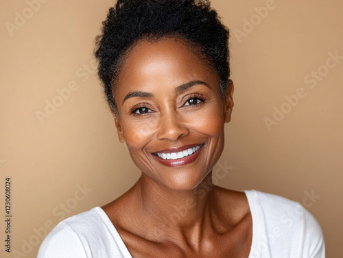 Smiling woman with radiant skin in neutral setting