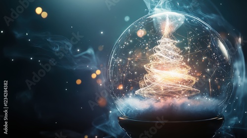 Smoke Christmas tree Concept. A magical snow globe featuring a luminous Christmas tree surrounded by ethereal wisps and sparkling effects.