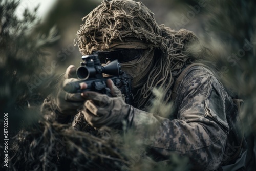 Sniper hidden in the woods taking aim to shoot. The image conveys a sense of danger, stealth, and military tactics Generative AI