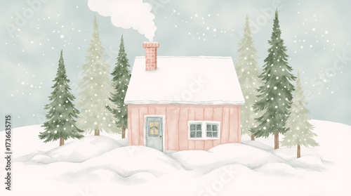 Snow-covered cabin with rising chimney smoke surrounded by evergreen trees in a winter wonderland scene