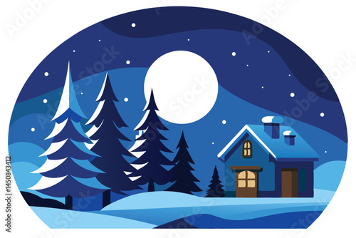 Snowcovered house shines under a full moon surrounded by pine trees on a clear night