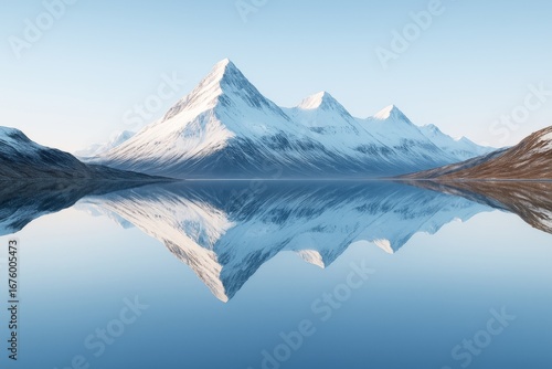 Snow-covered mountain peaks reflected in calm lake under clear blue sky, creating peaceful and creative winter landscape background scene. Ai generative