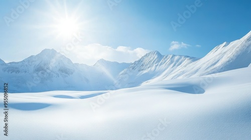 Snow-draped mountains under a bright winter sun, showcasing the pristine beauty of high altitudes