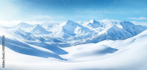Snowy mountain range under a clear blue sky, showcasing winter tranquility.