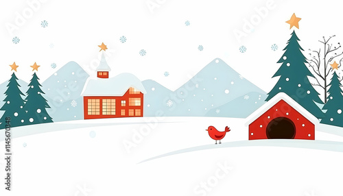 Snowy Winter Village Scene with Bird, Christmas Trees, and Mountains; Holiday Card Design.