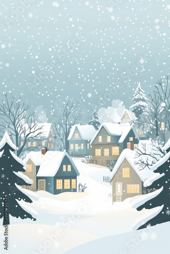 Snowy winter village scene with houses lit from within, snow falling from the sky, and snow-covered pine trees