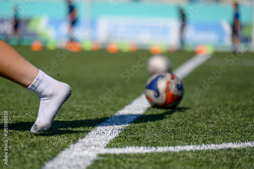soccer, player, foot, ball, turf, training, sport, grass, artificial, kick, athletic, footwear, motion, field, game, equipment, competition, action, summer, team, exercise, cone, goal, score, play, energy, dynamic, athleticism, performance, agility, speed, movement, surface, green, line, white, shadow, sharpened, closeup, detail, background, texture, activewear, practice, youth, leisure, activity, fitness