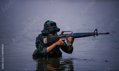 Soldier with weapon rifle on hand stayed in the water for protect from enemy.