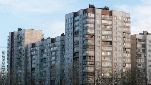 Soviet-era panel apartment building illuminated by sunlight on one side, surrounded by leafless trees in autumn.