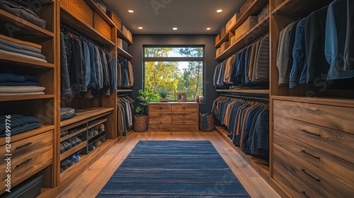 Spacious walk-in closet with wooden shelves, drawers, clothes, shoes, and a window.