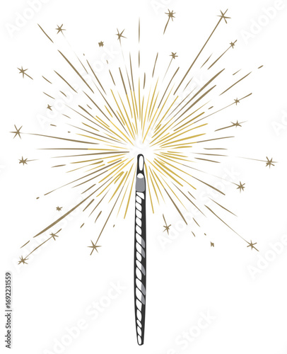 Sparkler illustration with golden sparks and stars on white background