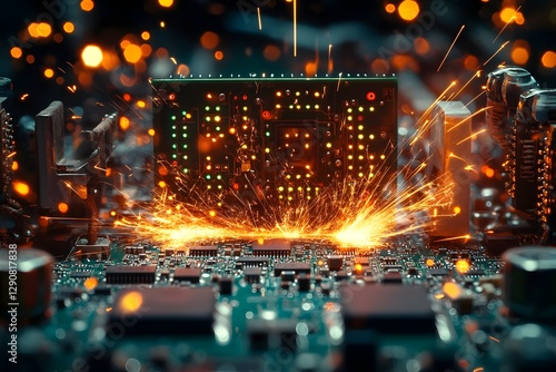 Sparkling Technological Brilliance Intricate Circuit Board with Glowing Microchips and Vibrant Electrical Sparks