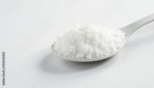 Spoonful of white sugar against white backdrop, ingredient, isolated