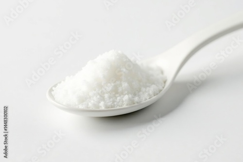 Spoonful of white sugar against white backdrop, macro, powdered sugar, background