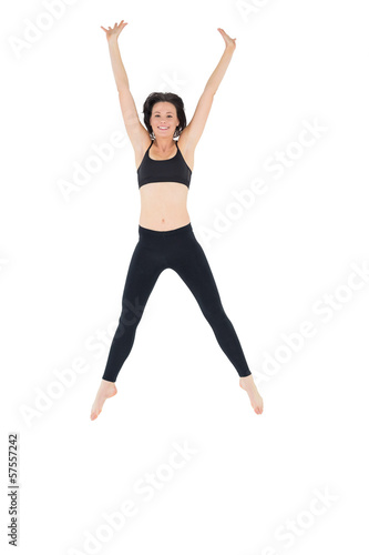Sporty young woman jumping over white background