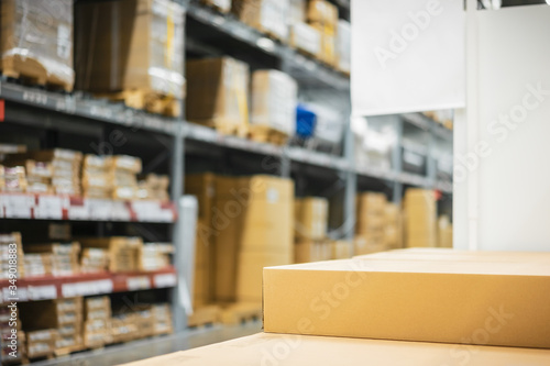Stack of cardboard boxes in smart warehouse industry logistic.