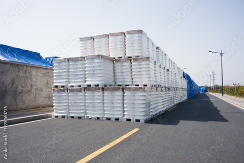 Stacked white plastic barrels of goods stored beside a road in an industrial logistics area