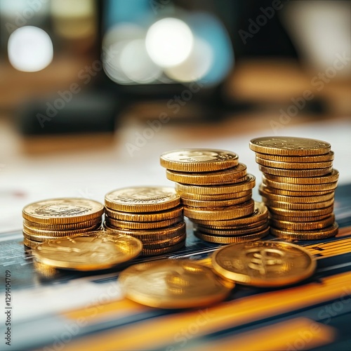 Stacks of Golden Coins: A close-up shot showcases multiple stacks of gold coins arranged on a patterned surface, symbolizing wealth, savings, and financial prosperity.