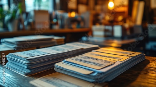 Stacks of organized cards on a wooden table in a cozy setting.