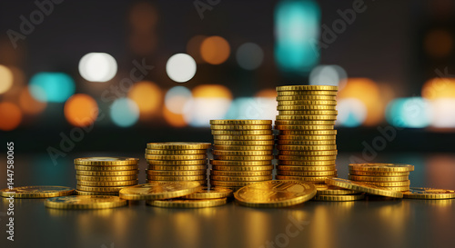 Stacks of Shiny Gold Coins on a Dark Surface with Blurred Bokeh Background Representing Wealth and Financial Prosperity