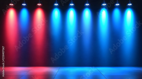 Stage Lights Illuminate Empty Space: Red and Blue Beams Create Dramatic Ambiance for Event, Show, or Presentation.