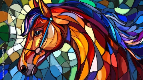 Stained glass art of horse head in vibrant colors, artistic expression concept