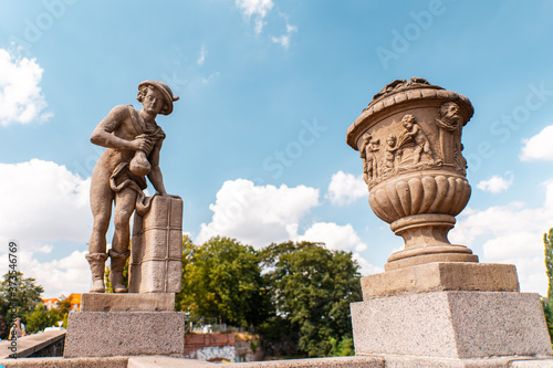 Steinerne Statue und Vase auf der Puppenbrücke in Lübeck