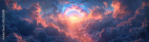 Steps to paradise, climbing through billowing clouds towards a brilliant arch, illuminated by heavenly light, evoking themes of redemption and hope