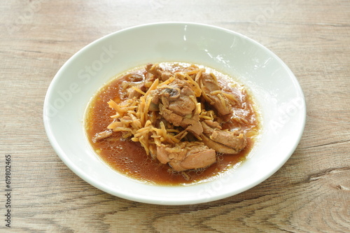 stir fried spicy chicken with slice ginger in soy sauce on plate
