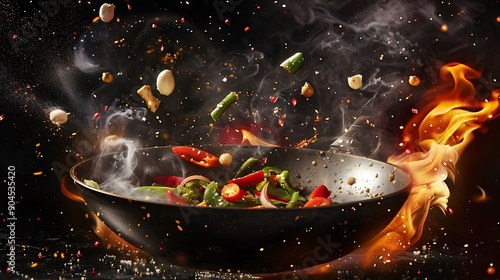Stir-fried vegetables in a wok over a fiery flame.