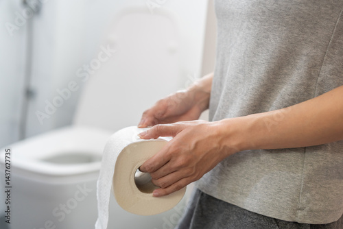 Stomach ache, sick asian young woman holding stomach pain and holding tissue paper roll in bathroom, standing near toilet, girl suffer from diarrhea her stomach painful. Hygiene, health care concept.