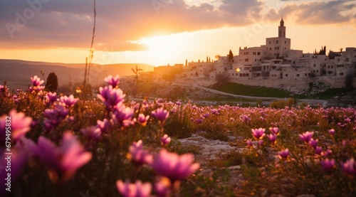 Stone buildings adorned with vibrant floral. Generative AI