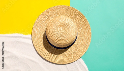 Straw hat on sand against a yellow and teal background