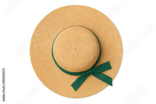 Straw sun hat with green ribbon for summer fashion, beach accessory, and vacation wear, top view on transparent background