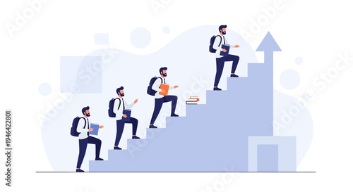 Student climbing stairs with books and backpack, symbolizing growth and education