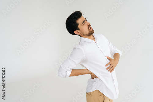 Studio portrait of unhealthy young man in shirt touching injured sore back, suffering lower lumbar discomfort, muscle pain of overwork, pinched nerve and grimacing on white isolated background.