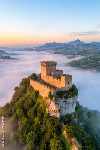 Stunning aerial view of a medieval castle perched on a hilltop, surrounded by mist and lush greenery, bathed in warm golden sunlight at dawn.
