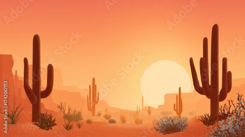 Stunning Desert Sunset with Cacti Silhouettes: A Tranquil Evening Landscape Showcasing Vibrant Orange Sky, Calm Wilderness, and Picturesque Natural Beauty in Remote Terrain