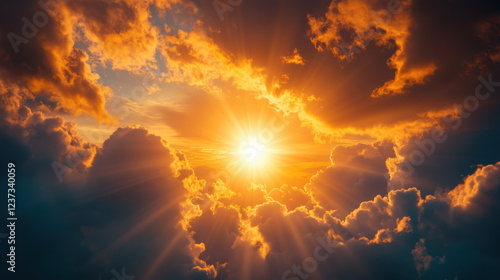 stunning view of sun peeking through vibrant clouds, casting warm rays of light. dramatic sky showcases blend of orange and blue hues, creating breathtaking atmosphere