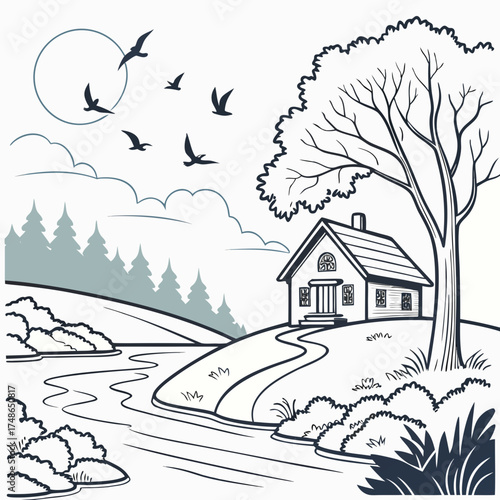 Stylized Countryside Landscape with House and River